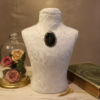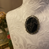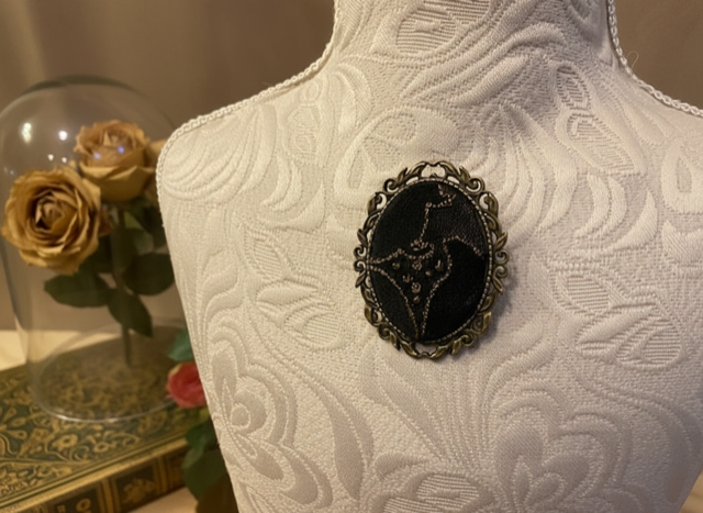 Cette broche ovale, délicatement brodée à la main avec un fil doré lumineux, est montée sur un tissu jacquard noir à motifs discrets. Son cadre en métal travaillé souligne l’élégance de la pièce et rappelle les accessoires d’antan, empreints de mystère et de poésie. Chaque point de broderie est réalisé avec soin, dans une démarche artisanale qui fait de ce bijou une pièce unique, impossible à reproduire à l’identique.